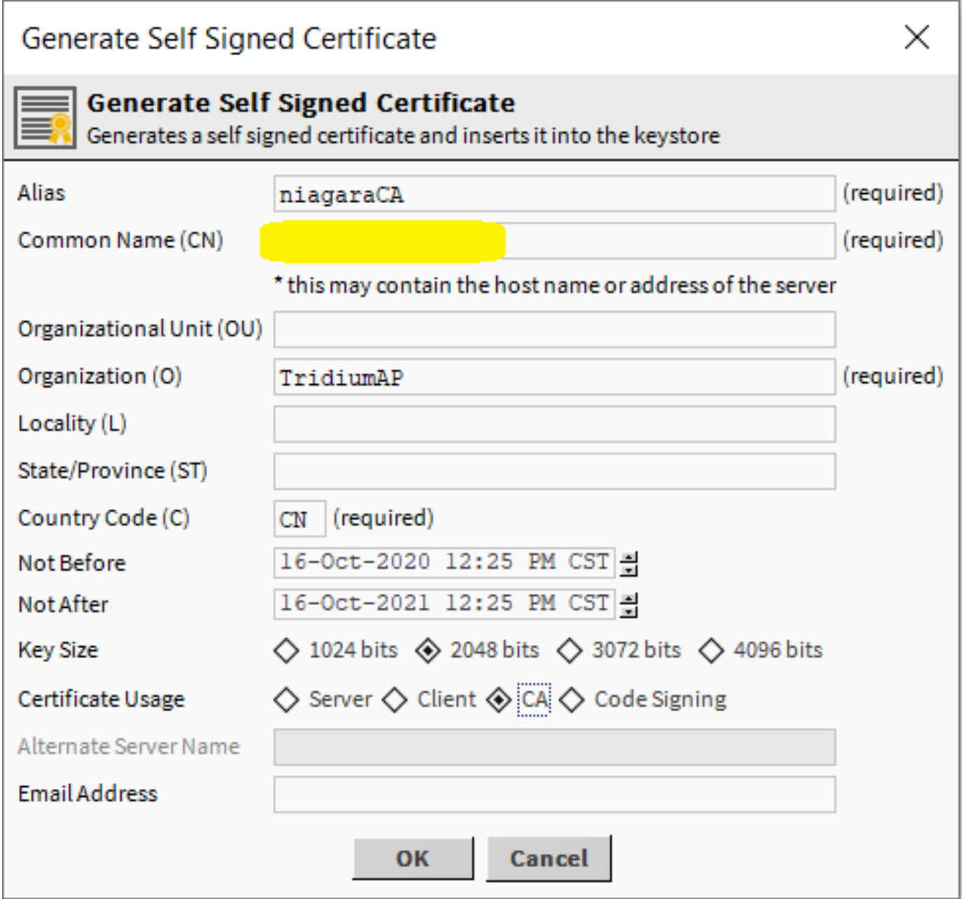 - Please Note: the Common Name (CN) should contain the host name or the address of the server, and ensure to select the "CA" Certificate Usage.