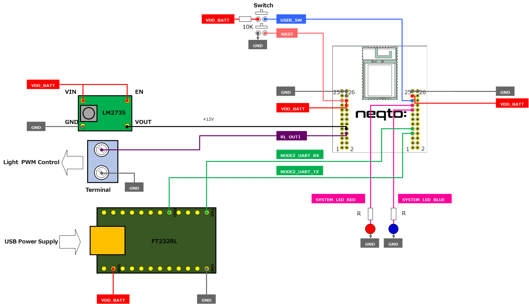 - USB給電および必要に応じてneqto Bridgeのシリアルコンソールを使用するため、FT232RL USBシリアル変換モジュールを使用します。